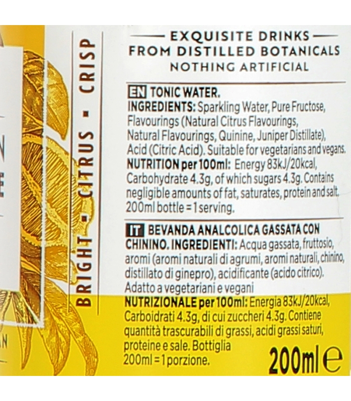 Frais et pétillant, avec son zeste de citron et son huile de citron vert pressé à froid, ce tonic dépasse les arômes d'agrumes habituels, révélant des notes de calamansi et une délicate touche de chinotto.