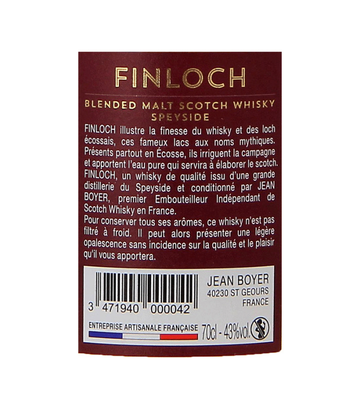 Finloch regroupe plusieurs références, chacune est constituée d’un single Malt embouteillé en France par la maison Jean Boyer ; d’où la dénomination Blended Malt.