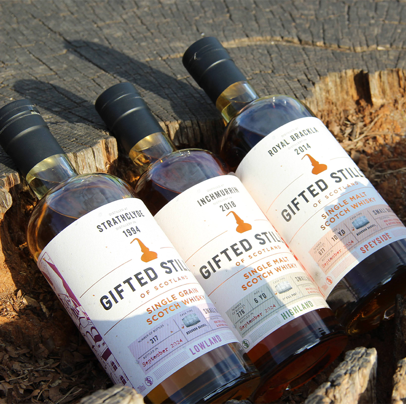 Nos fûts, sélectionnés parfois depuis plusieurs années et stockés à travers toute l’Écosse, sont acheminés dans des centres de conditionnement où ils sont mis en bouteille sous la marque Gifted Stills of Scotland.